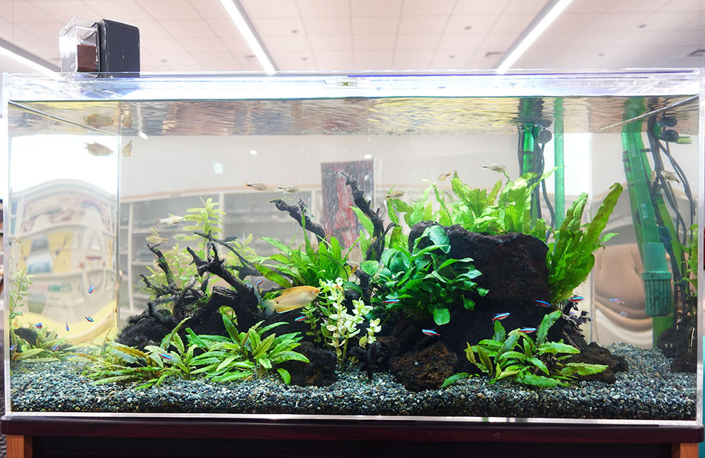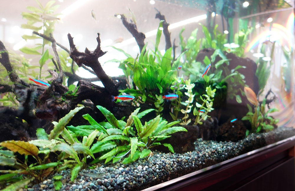 アクアリウムは目を惹くインテリアで、美しい水景を眺めていると穏やかな気持ちになります。