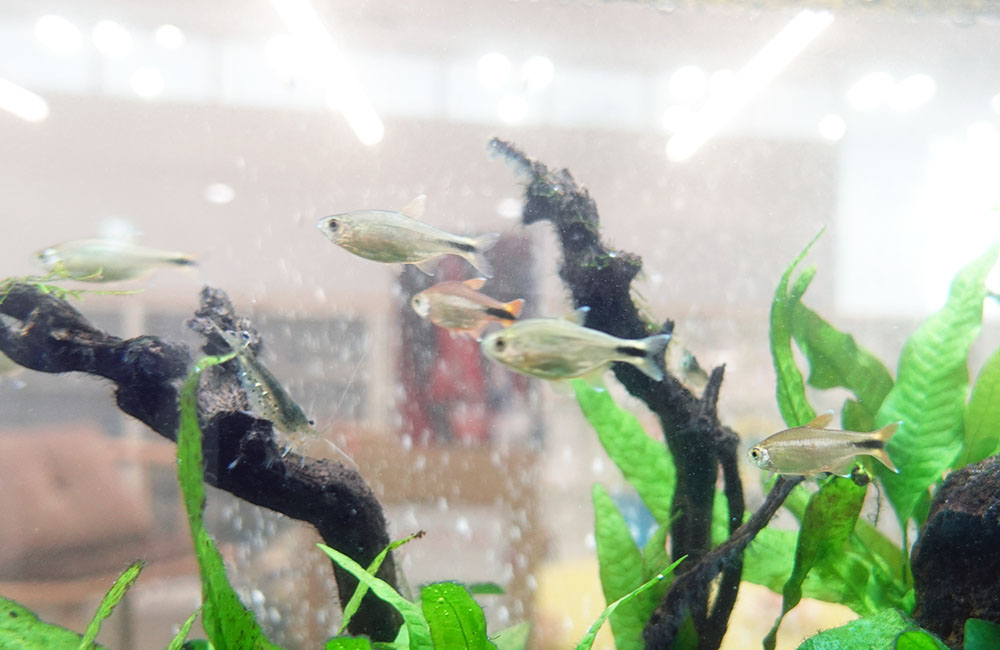 こちらの水槽には、赤と青のコントラストが美しい『カージナルテトラ』や、金色が映える『ゴールデングラミー』などの小型淡水魚を導入しています。