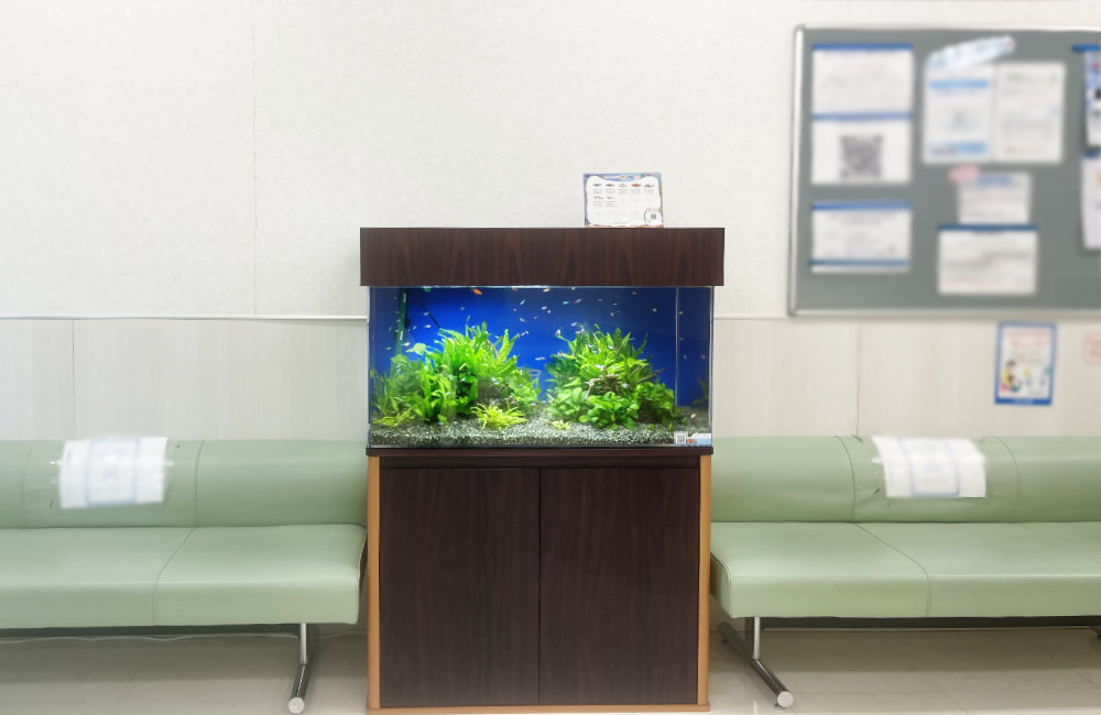 クリニック内の待合スペースに設置したこちらの水槽は、緑豊かな水草水槽となっており、患者様がリラックスした気持ちで待ち時間をお過ごしいただけます。