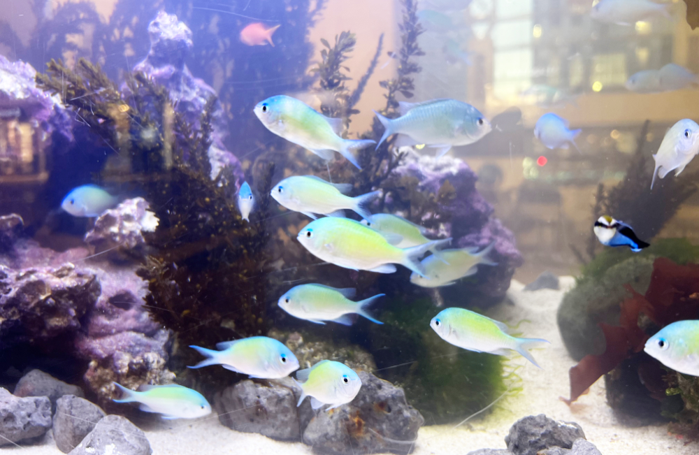 キンギョハナダイやデバスズメダイなどの小型海水魚は、群れで暮らす習性があり水槽内でも群泳が見られるため、見応えもしっかりあります。